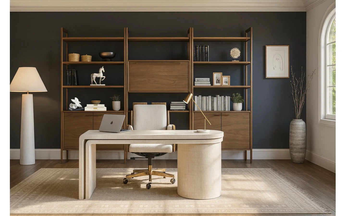 Our Home Office Projects through E-Design are designed to create a functional, inspiring workspace that reflects your style. Each design includes an inspiration board, smart floor plan layout solutions to enhance productivity, and a realistic 3D render of your office. You'll also receive a clear budget breakdown, a clickable shopping list, and a step-by-step guide plus ongoing designer support to fine-tune every detail along the way.